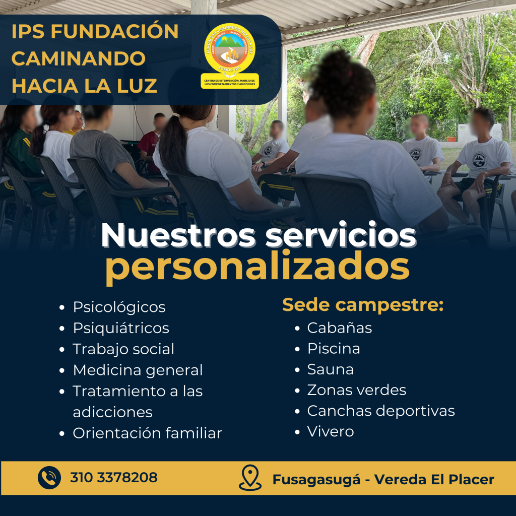 La FUNDACIÓN CAMINANDO HACIA LA LUZ, es una entidad sin ánimo de lucro, de carácter privado, prestadora de servicios de salud (IPS) que ofrece sus servicios a la población en alto riesgo de consumo de sustancias psicoactivas (SPA).
